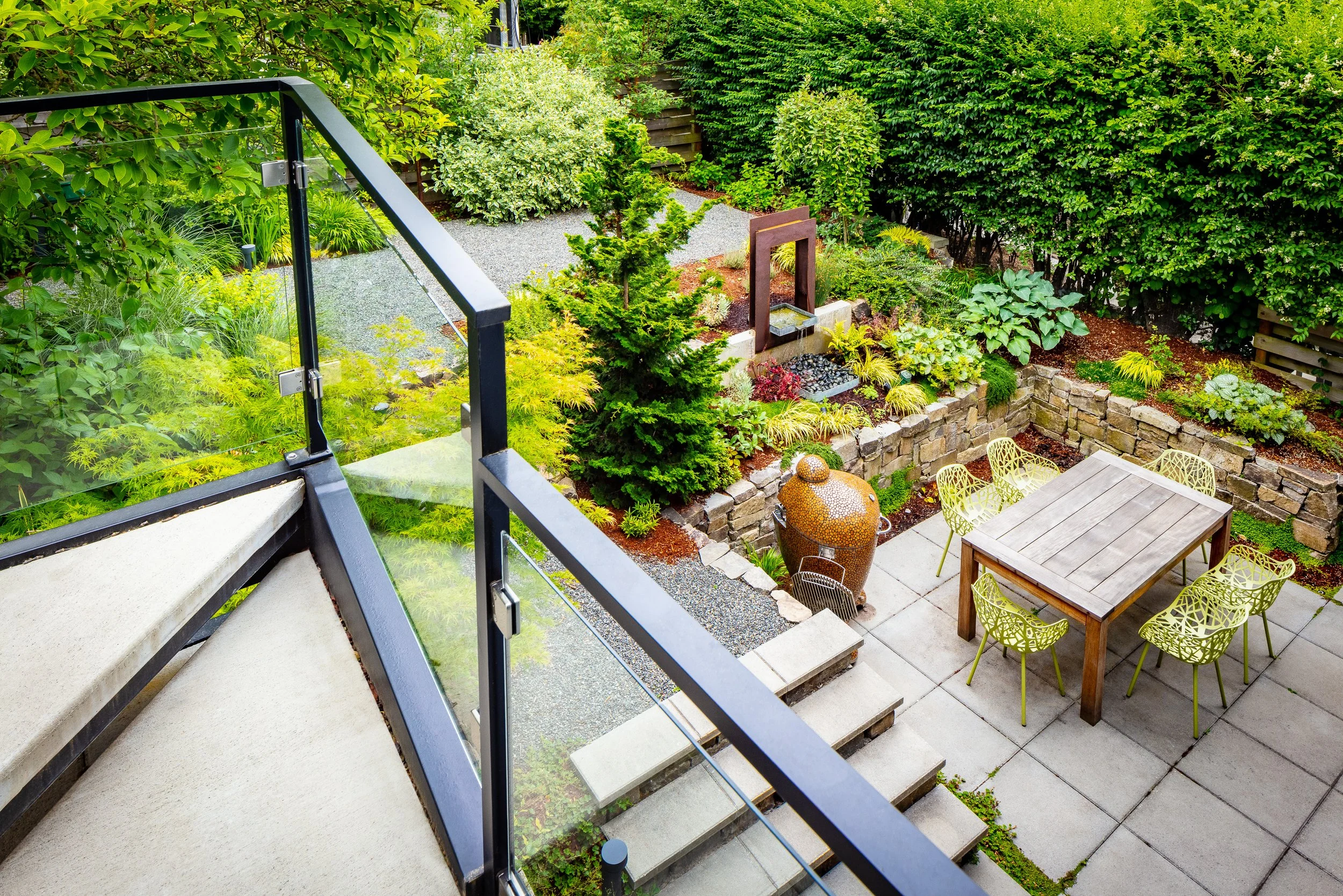 Rooftop deck w/ custom steel landing and stair access w/ custom glass railings