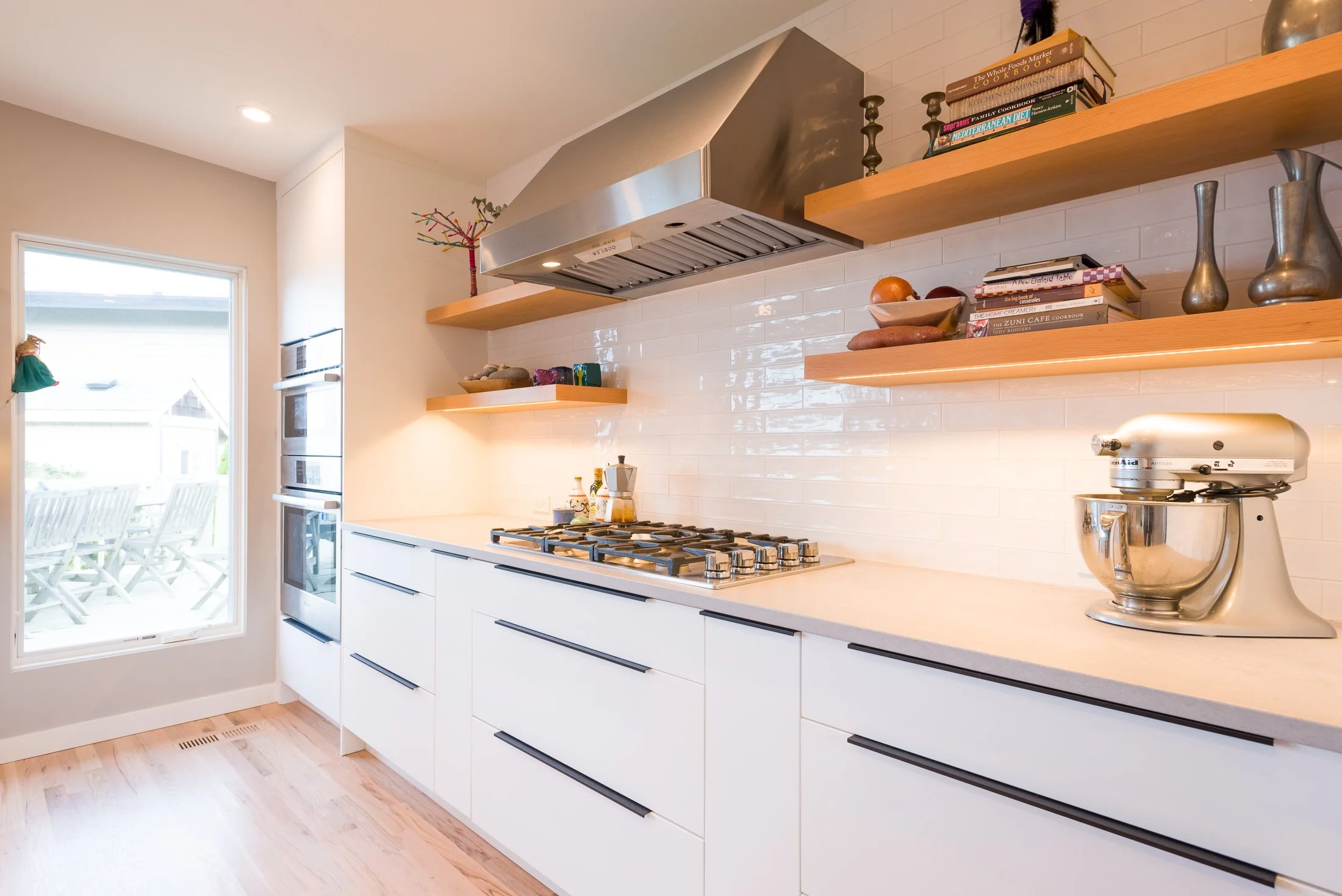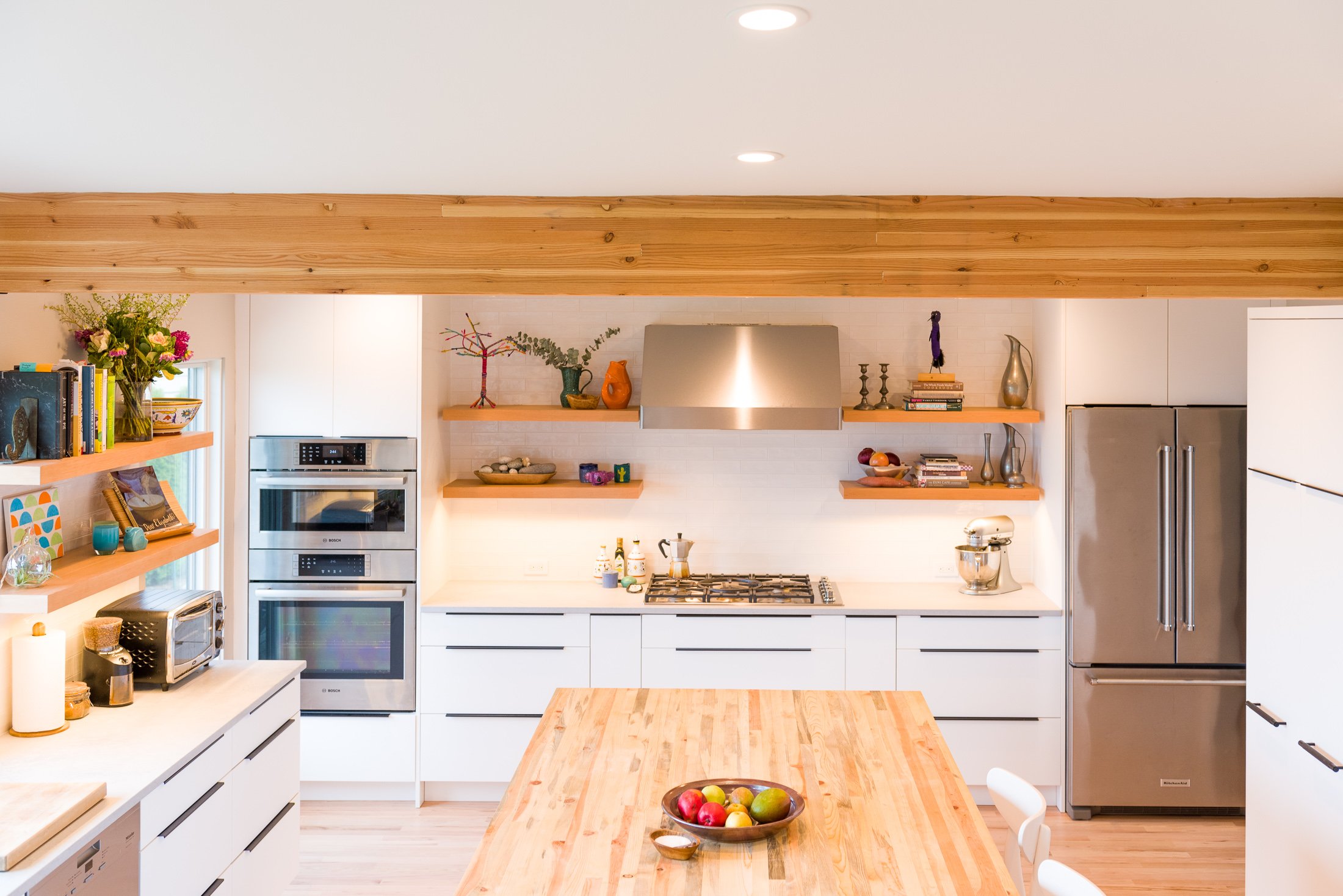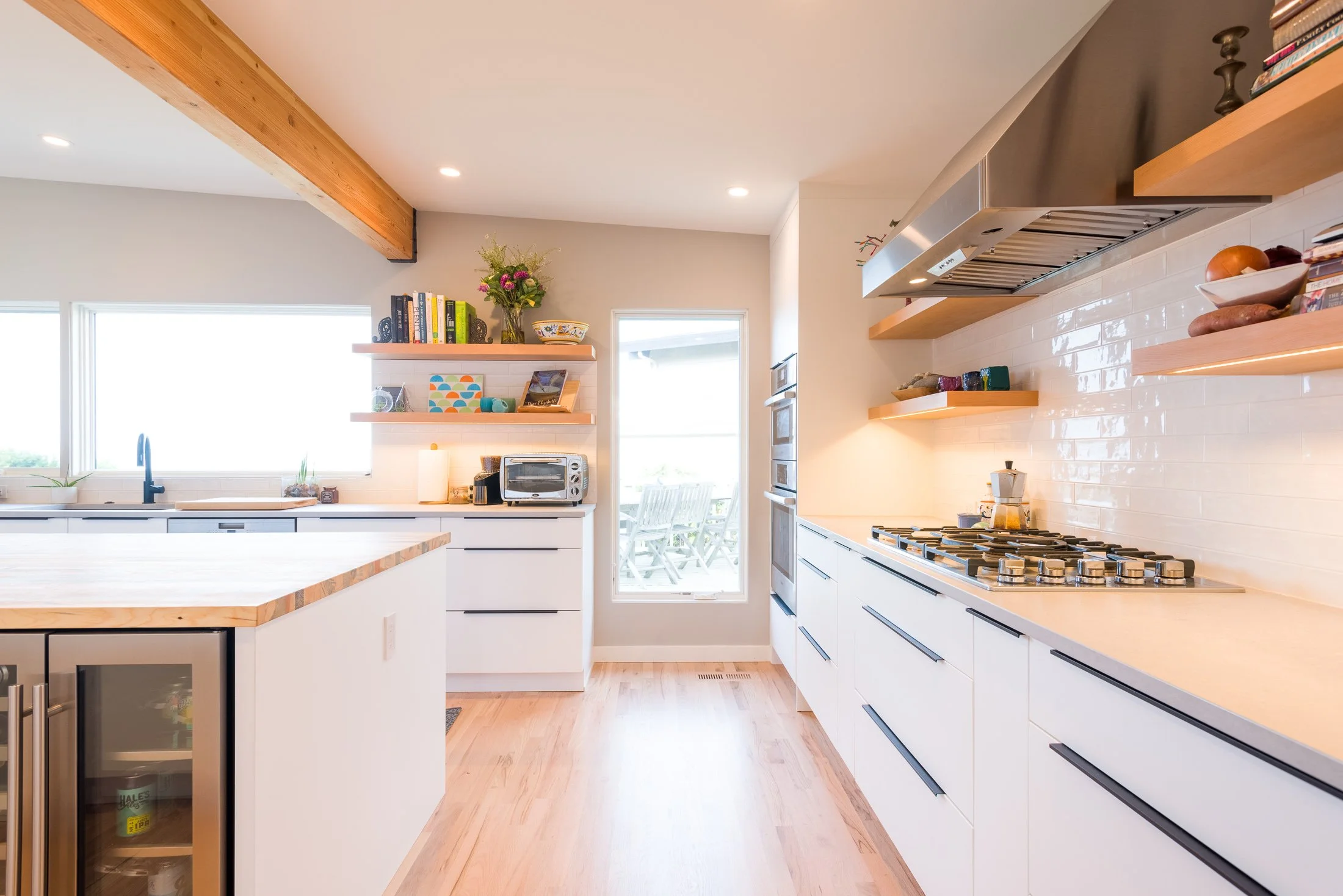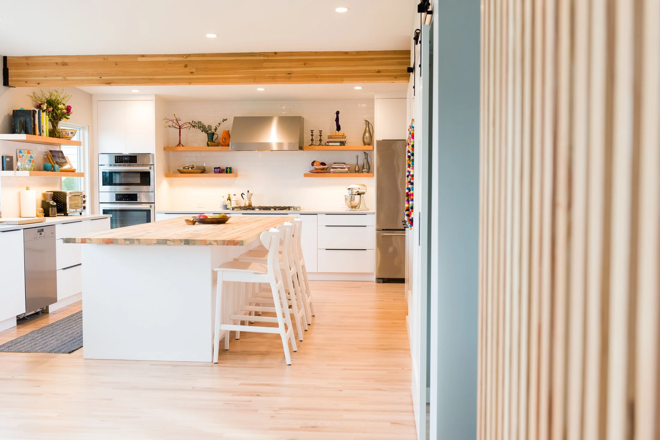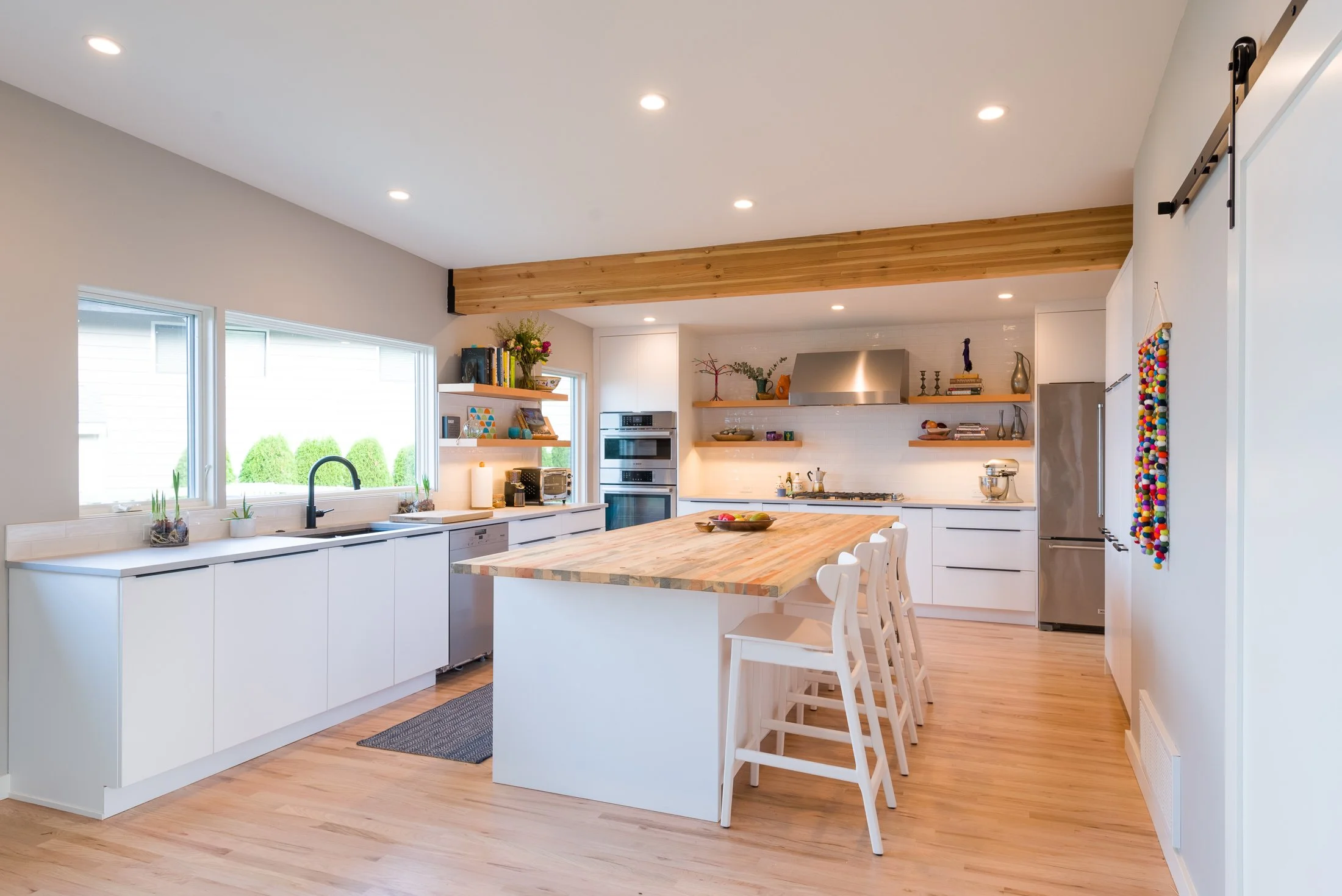 Wanting to capture scenic views of Puget Sound and allow more natural light throughout the house, we removed walls to bring the focus to the kitchen, attached mudroom, office, and expansive deck to enjoy the PNW sunsets and optimize the natural flow of the home. The kitchen features a flat panel white cabinet package and stunning blue beetle wood butcher block island for a clean and modern build with warm natural wood trim and screening wall touches.