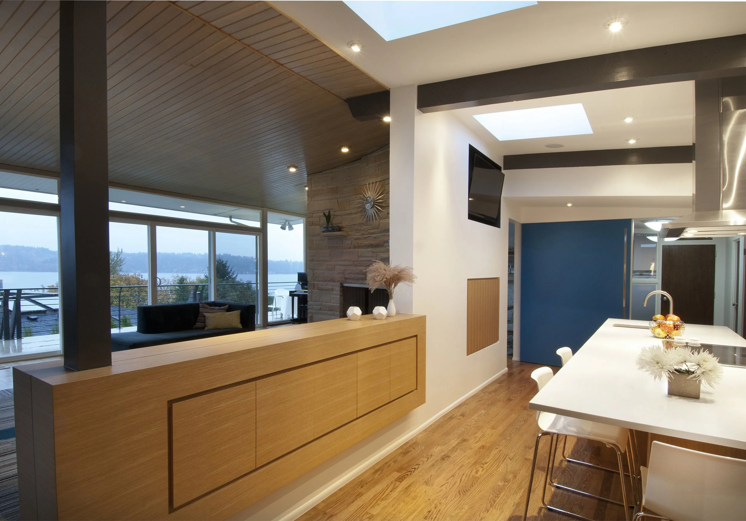 To create a more open and inviting entertainment space in this mid-century modern home, we removed the walls that had isolated the kitchen, creating stronger connection between the living and dining areas with open views throughout. We added skylights to increase the natural light, along with a linear rift white oak cabinet package with a custom walnut inlay to embrace the natural wood tones. Through a large moving wall panel, we added a mud room with custom built-in cabinets.